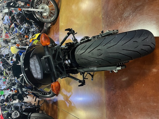 Bright blue and contrasting black bodywork that’s offset by yellow graphics cover the street fighter bodywork that helps create an ergonomically comfortable, yet sporty riding position.