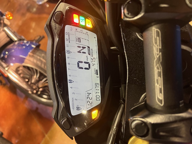 Similar to a SV650, the lightweight and compact instrument panel uses an LCD display that includes speedometer, tachometer, odometer, dual trip meters, gear position, coolant temperatures, driving range, average fuel consumption, instantaneous fuel consumption, traction control and ABS alert icons, and a clock.
